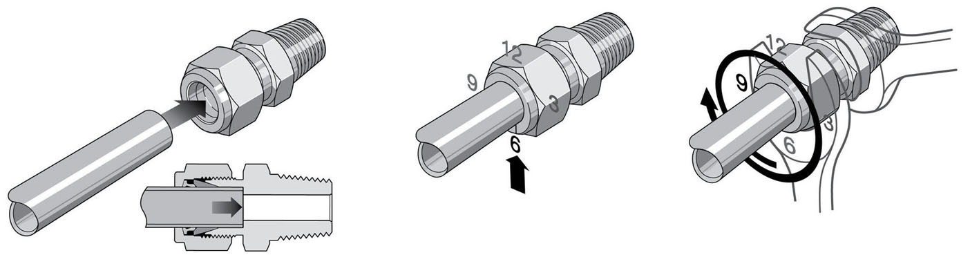 1、 把卡套管完全插入接頭內(nèi)并頂住肩部,用手將螺母擰緊;高壓應(yīng)用和高安全系數(shù)系統(tǒng):進(jìn)一步擰緊螺母,使卡套管無法用手轉(zhuǎn)動或無法沿軸向在接頭內(nèi)移動;